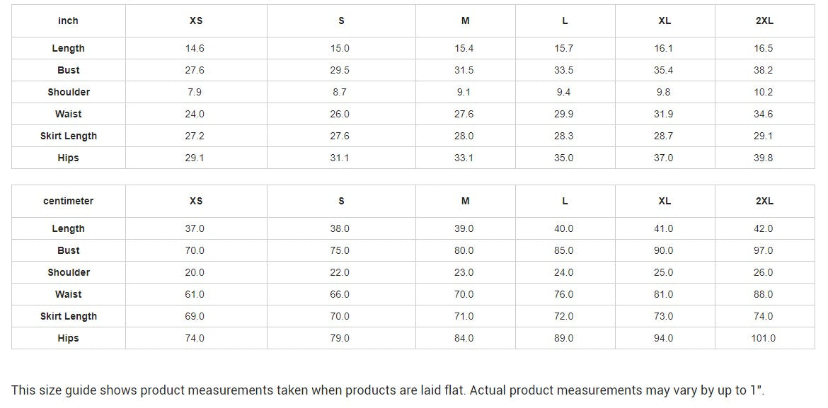 | Skirt Length | 27.2 | 27.6 | 28.0 | 28.3 | 28.7 | 29.1 |